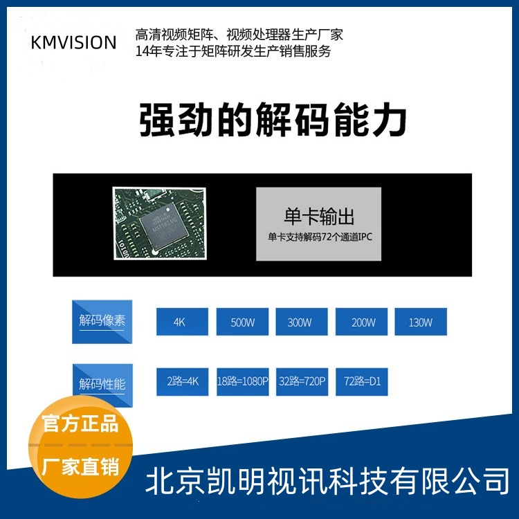 |凯明视讯是国内最早研发生产网络矩阵解码上墙系统的厂家之一,采用嵌入式Linux结构,选用华为海思解码能力最强的芯片,可以支持4K接入,单屏可解9路1080P、16路720P、36路D1格式的网络视频信号,支持本地信号源接入。常规的网络矩阵是模块化插卡式结构,多条网线接入的方式,对核心交换机的网口数量考验比较大。考虑到有些项目的交换机网口有限,我们最近又开发出一款新品网络矩阵,只需要接入一条网络便可完成对大量的摄像头进行解码上墙。针对不同的项目需求和应用场景,|凯明视讯均有与之匹配的产品解决方案,欢迎大家一起交流探讨。