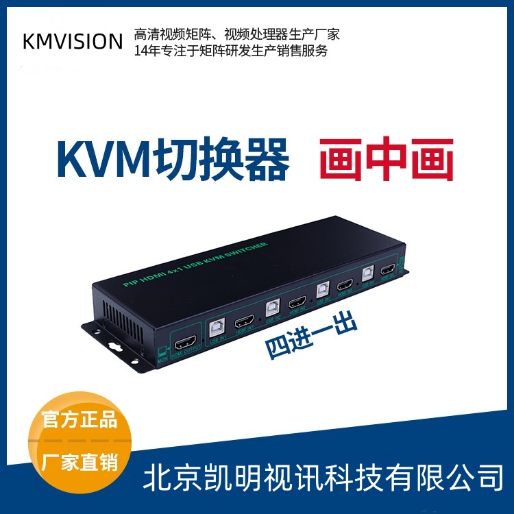 高清四路视频切换器是一款对视频信号进行多对一切换的设备,可以将4路视频信号从输入切换到1路输出通道上,经过|凯明视讯研发人员的改造升级,它具有独特的开窗功能,可以显示一大四小的画面,也就是画中画显示功能。采用专业的切换处理芯片,输出稳定,图像清晰,支持音频输出。主要应用于会议室、多媒体教室、展厅等场所,相较于迷你型高清四画面分割器,少了均等分割屏幕的功能。
