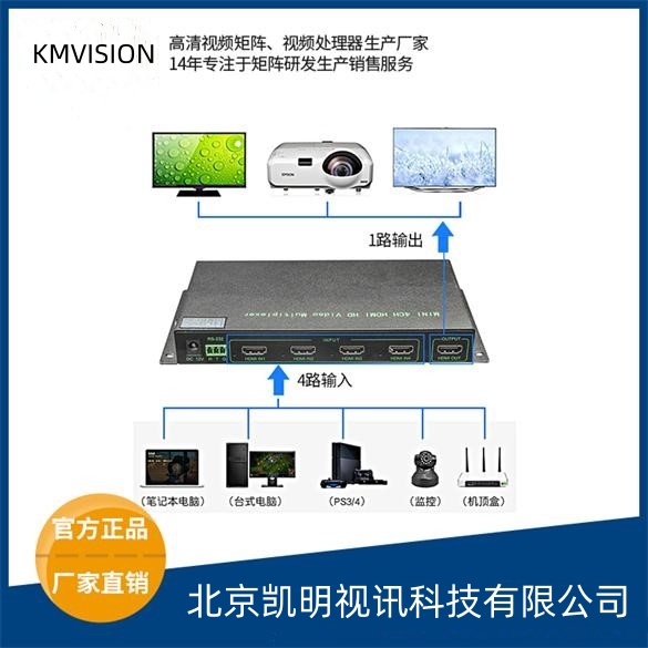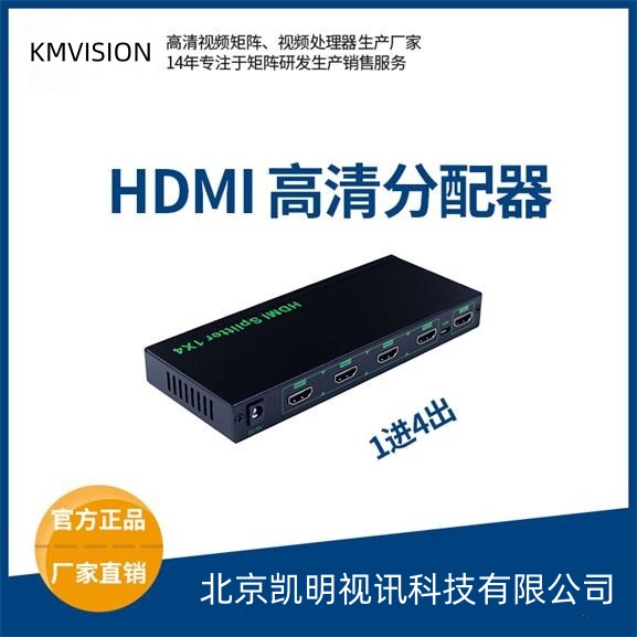 4路HDMI画面分割器主要功能是把4路视频信号合成为一路输出,在一台监控显示器上同时显示1/2/3/4个画面,实现在单屏幕上同时显示出多个画面。此外,画面分割器还具有单路回放的功能,即可以选择同时录下的多路信号视频信号的任意一路在监视器上满屏播放。|凯明视讯研发生产的画面分割器专门用于需要当显示屏显示多个清晰度高的视频画面的场合,专为大中型的监控、调度、指挥室设计的产品,多用于指挥部、视频会议、多媒体多功能厅等场所,为这些场所提供了一套理想的视频显示解决方案。由此可见,1进4出HDMI分配器和画面分割器的功能是不一样的,用户可以根据项目的实际需求来选择对应的设备。