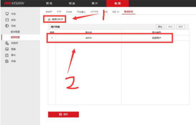 然后在集成协议界面下选择“启用onvif”选项打钩,添加账户,设置账户名、密码,最好选择为管理员权限,这样使用的范围较广;设置好onvif协议的账户密码后,无论是网络高清视频解码器矩阵的调用,还是做二次开发用都可以鉴权成功了。