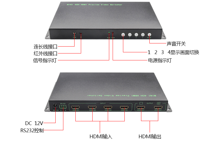 高清四画面分割器又称多窗控制器,视频分割器,画面分割器等,是专用的视频处理与控制设备,主要功能是在高分辨率的显示设备(平板/投影机)上以全屏或多窗口模式同时显示多路视频信息;也就是将多路高清视频画面,选择其中的部分通道或者全部通道在显示器件上分割显示。简单讲就是将4路/3路/2路高清信号,合成一路高清信号输出到一个显示器上同时显示出来。它是一款专业的高端图像处理设备,本质上是将多路高清视频信号合成一路高清信号,在一个显示终端上同时显示多个动态画面。专为要求高质量显示多个视频画面的场合设计。