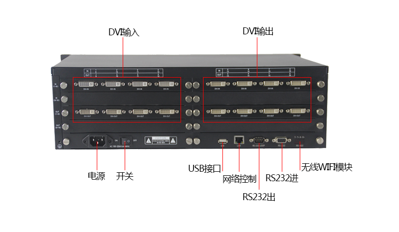 9、支持通过前面板按键盘、遥控器或者RS-232,RS-485控制显示设备的输入源;
