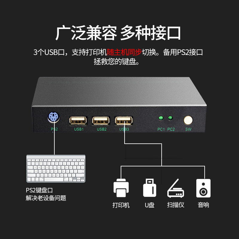 我公司生产的画中画 USB端口KVM系列切换器通过一组设备显示器、键盘、鼠标实现对多台计算机的操作。从而节省了为每台计算机单独配置键盘、鼠标、监视器的费用以及它们所占用的空间。我公司KVM系列内置了2个或4个上游USB设备端口、2个下游USB主机端口、1个PS2主机端口及切换控制信号的USB KVM控制芯片,最多支持4台PC共享一套键盘、鼠标及显示器。与PC和设备之间的连接均采用USB方式,支持即插即用,无需安装驱动程序,简单易用。随着PC机旁边的USB设备越来越多,但市场上的KVM设备还仅仅是USB的鼠标和键盘,我公司创新性开发的这些2口和4口的HDMI信号KVM切换器和HDMI信号KVM切换器打破传统的方式,为方便用户,开创性的设计了USB下游USB主机端口除了可以连接USB-HID类设备。根据KVM切换器的接口个数,我们定义了二端口的KVM切换器,可以同时接入二台PC机,四端口的KVM切换器,可以同时接入四台PC机。由于现在用户对视频信号的要求,显卡上有HDMI输出端口非常普及。根据PC机的视频信号接入,我们有HDMI信号的KVM,也有HDMI信号的KVM切换器。真诚服务是我们的理念,顾客满意是我们的宗旨。本公司将以最优惠的价格提供给客户最好的产品,并竭诚为客户提供优质服务。