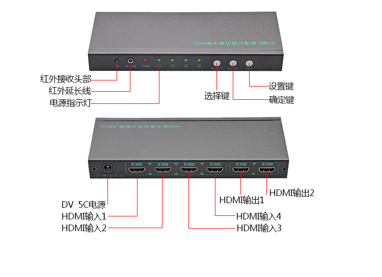 2、支持4个HDMI高清设备同时输入2个HDMI高清输出。