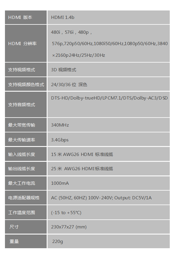 6、支持视频信号增强,信号输入/输出两端最长均支持25米HDMI线缆。