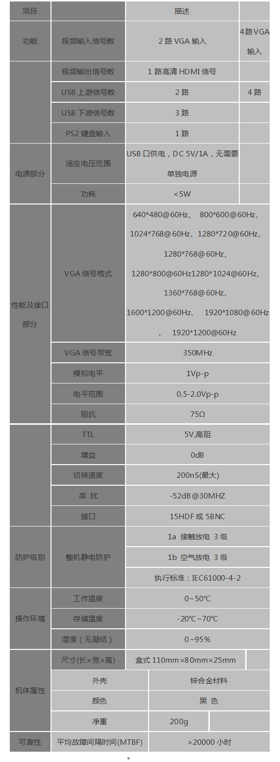 KVM系列内置了2个或4个上游USB设备端口、3个下游USB主机端口、1个PS2主机端口及切换控制信号的USBKVM控制芯片,最多支持4台PC共享一套键盘、鼠标、扬声器、麦克风及显示器。与PC和设备之间的连接均采用USB方式,支持即插即用,无需安装驱动程序,简单易用。我公司创新性开发的此系列产品打破传统的方式,开创性的设计了USB下游USB主机端口除了可以连接USB-HID类设备,如:USB键盘、鼠标以外,还可以连接一些常用的非USB-HID类设备,如:U盘、打印机、摄像头等。